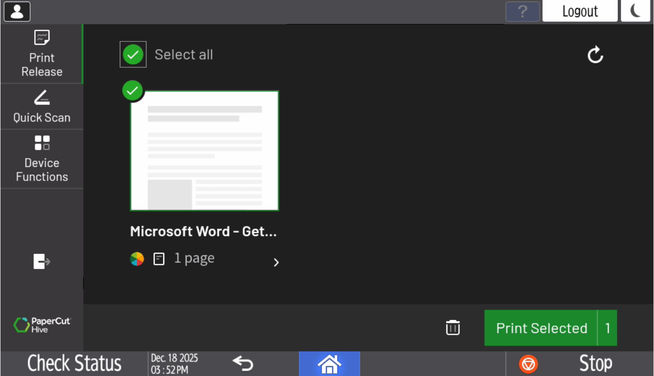 - Print Selected can be used to print any print jobs submitted to the Papercut - IMG Academy Student printer. Simply select any jobs from this screen you’d like to print and select Print.