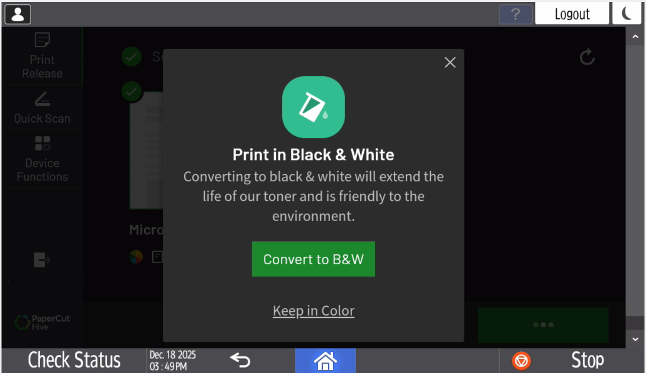 - When printing a Color or 1-sided document, you may be asked to convert the job to Black & White or 2-sided to save on toner and paper. If the document does not need to be printed in color or 1-sided, you may choose to convert the job to the recommended settings. If the job does need to be printed with the properties it was submitted with, select Keep in Color or Keep as 1-sided.