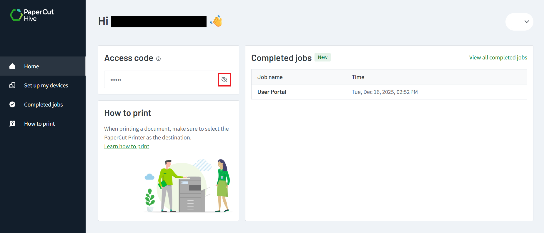 - Once Signed in Select the “Eye” to see code. (This code is needed to log into the Printer)