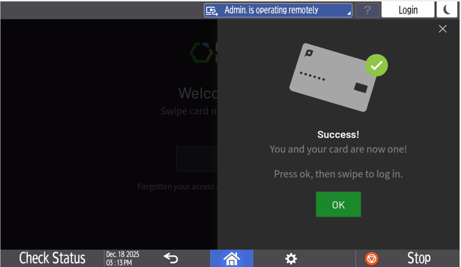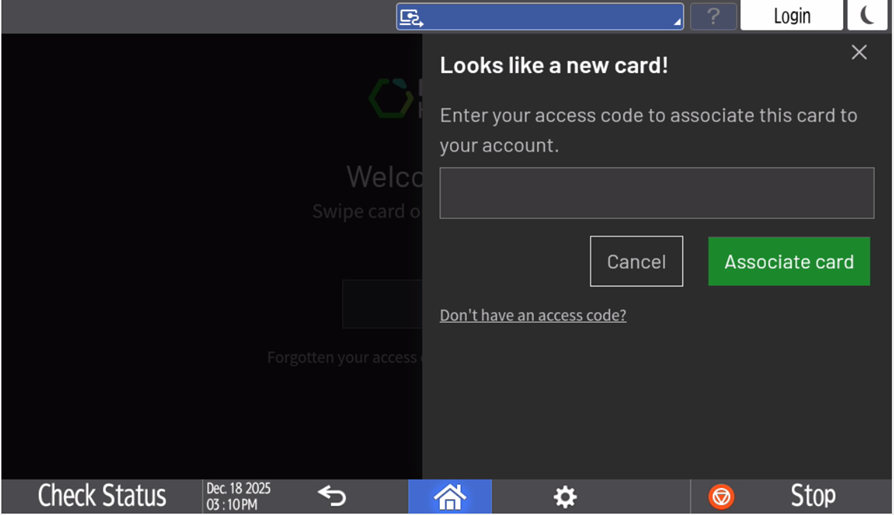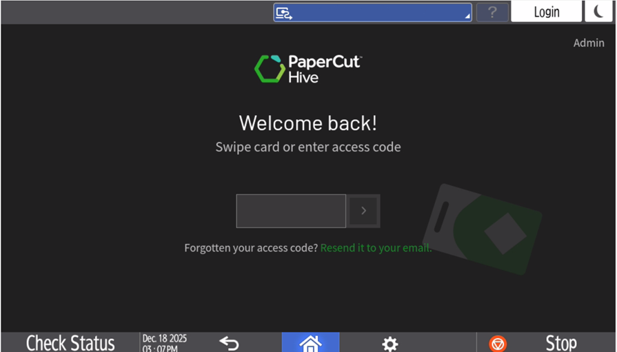 How to Login to Printer (Student) December 29, 2025 21:14 Updated Make sure you can see the login screen Scan your ID Badge Input your Access Code and Associate Card and you will see a Success screen (See Getting Access Code for Papercut Printer) Scan ID Badge to Log In See (How to Print to Papercut Printer) Related articles How to Print to Papercut Printer (Student) Getting Access Code for Papercut Printer (Student) How to Install Papercut Printer (Windows)